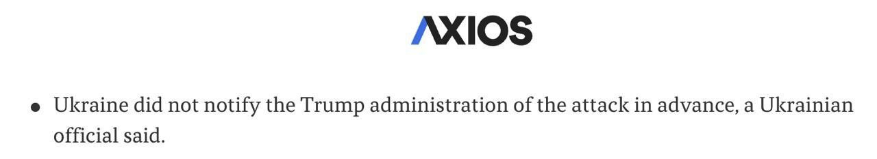 ➖"Украина заранее не уведомила администрацию Трампа об атаке, сообщил украинский чиновник", - теперь пишет Axios.