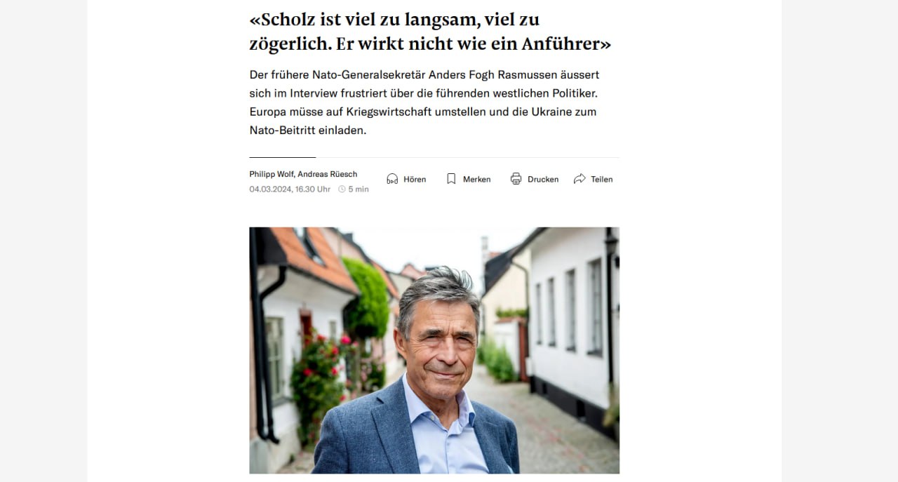 📝 «Правительство Германии должно быть гораздо более решительным. Канцлер Шольц слишком медлителен и нерешителен, он не похож на лидера», – заявил Расмуссен.