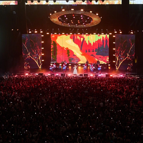 Весь концерт проходит на фоне больших экранов, на которых появляются странные тона. Иногда это напоминает старые заставки из приложений для караоке, иногда ковры. В общем, красочность концерта вытянута на максимум и иногда балансирует на грани кича.