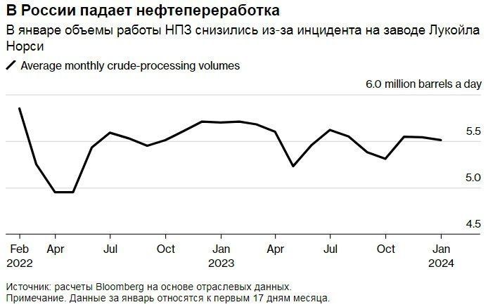 Объемы переработки нефти в России продолжили снижаться из-за сокращения объемов производства на нефтеперерабатывающем заводе Норси ПАО «Лукойл». По словам человека, знакомого с отраслевыми данными, страна перерабатывала 5,5 миллиона баррелей сырой нефти в день с 11 по 17 января, что примерно на 11 000 баррелей в день меньше, чем в среднем за первые 10 дней месяца. Это также почти на 38 000 баррелей в день ниже, чем объемы переработки на протяжении большей части декабря, показывают расчеты Bloomberg. Из-за аварии на Нижегородском НПЗ поставки бензина на рынок сократились примерно на 200 тыс. тонн в месяц. При этом «Лукойл» начал скупать топливо у других производителей, чтобы снабжать собственные АЗС. @banksta