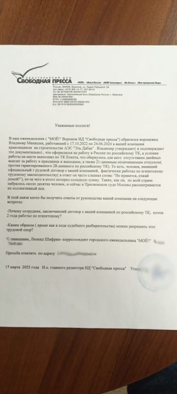 Воронежский крановщик Владимир Маняшин вместе с группой коллег из разных уголков России судится со строительной компанией АО «Концерн Титан-2». Смысл иска в том, что Маняшин подписал трудовой договор с «Титаном-2», и в октябре 2022 года отправился в Египет на строительство АЭС «Эль Дабаа». Он оформлялся на работу по российскому трудовому кодексу, а работал на месте по... ТК Египта. Это обернулось проблемами с выплатами. Таких работников, как Владимир, было несколько человек. Сейчас Пресненский суд Москвы рассматривает их коллективный иск к «Титану-2».