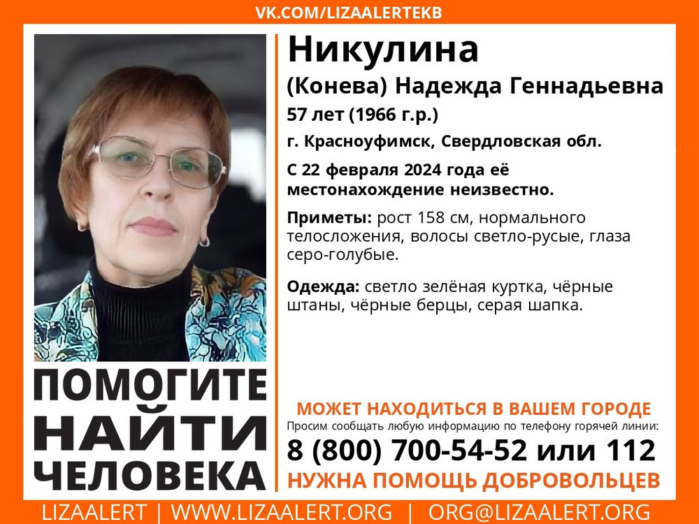 Надежда Никулина работает зоотехником в Красноуфимском Уралплемцентре. По словам друзей, в день исчезновения она ушла пораньше — 22 числа был сокращенный день — и должна была заехать за мужем. Но вместо этого написала ему сообщение: «Добирайся до дома сам», а свою машину бросила во дворах и пропала.