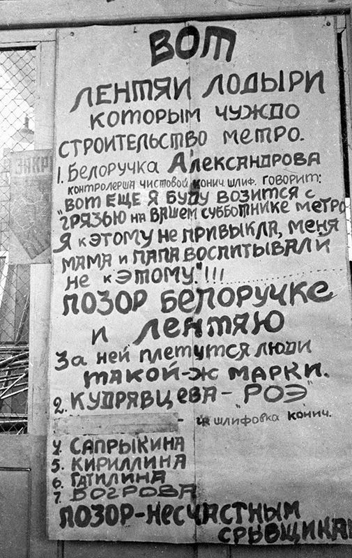 На плакате список лиц, которые не участвовали в субботнике во время строительства метро в Москве. 1934 год.