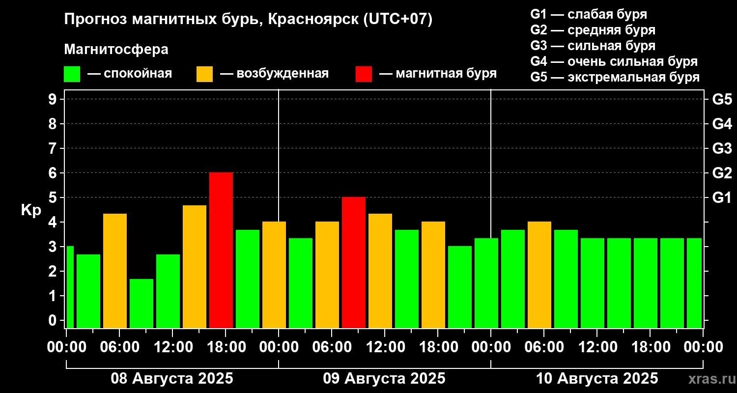 Согласно прогнозу, небольшие возмущения магнитосферы начнутся в Красноярске около 12 часов. К вечеру колебания усилятся и до 6 баллов — около 18:00 город накроет средняя магнитная буря.