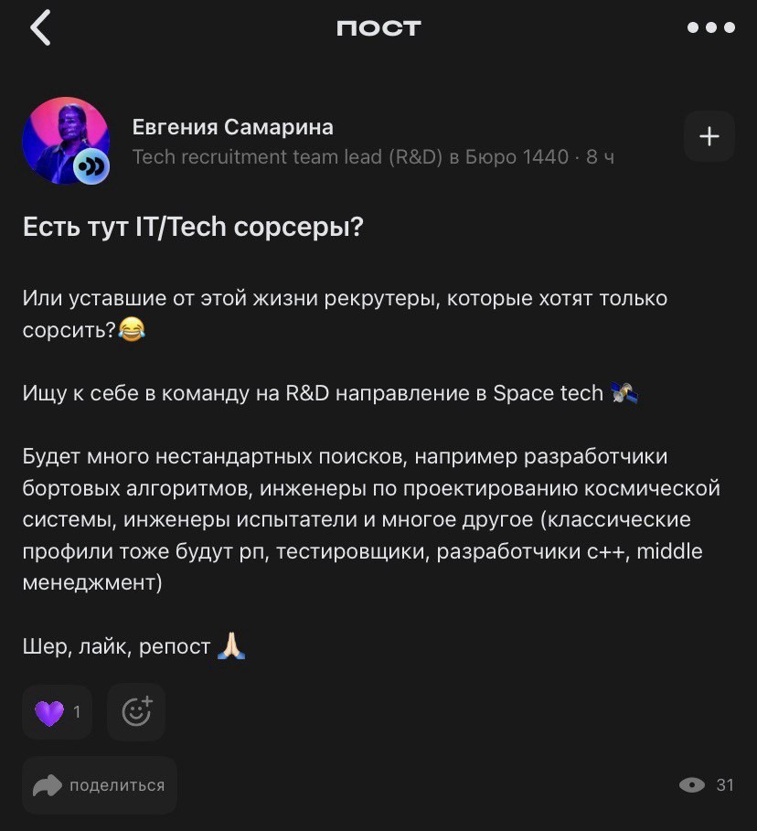 В своем посте Евгения Самарина не указала проект, для которого идет подбор, но при переходе на сайт "Бюро 1440" сразу становится понятна космическая тематика важнейших продуктов компании.