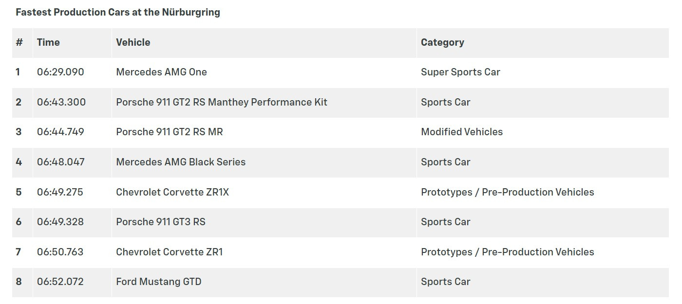 В официальной таблице рекордов Нюрбургринга нет национальных классов, но это, конечно, не мешает назвать Corvette ZR1X самым быстрым американским автомобилем на легендарной немецкой трассе: с временем круга 6 мин 49,275 с он побил ещё довольно свежий (установлен в апреле) рекорд Ford Mustang GTD — 6 мин 52,072 с.