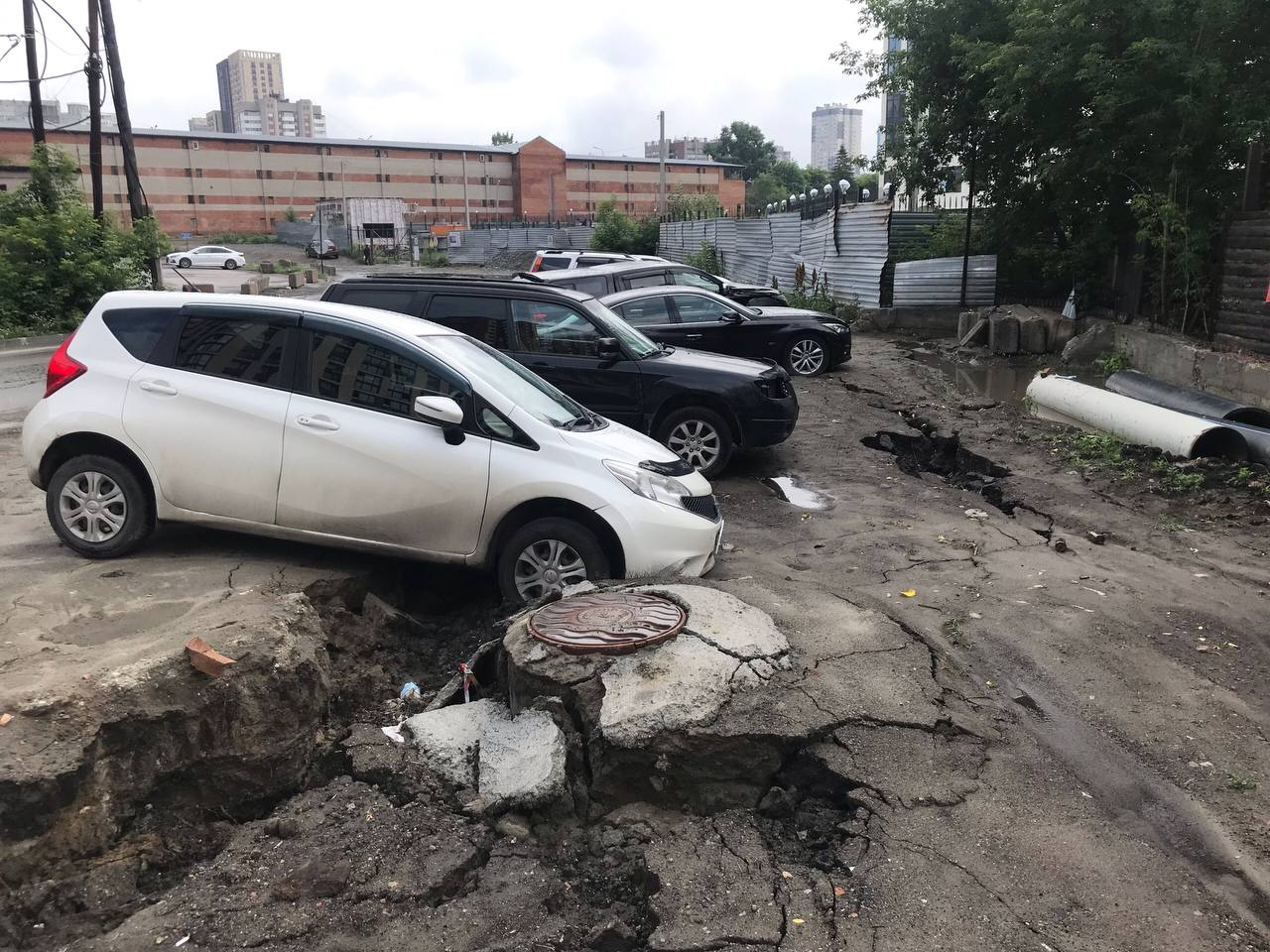 В Центральном районе Новосибирска грунт рухнул под колесами автомобилей на парковке. Фотографии происшествия опубликовали