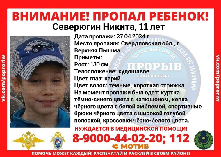 «Пропал ребенок! Никита Северюгин, 11 лет. Дата пропажи: 27.04.2024 года. Место пропажи: Свердловская область, город Верхняя Пышма. Нуждается в медицинской помощи!» — написали волонтеры в группе отряда «ВКонтакте».