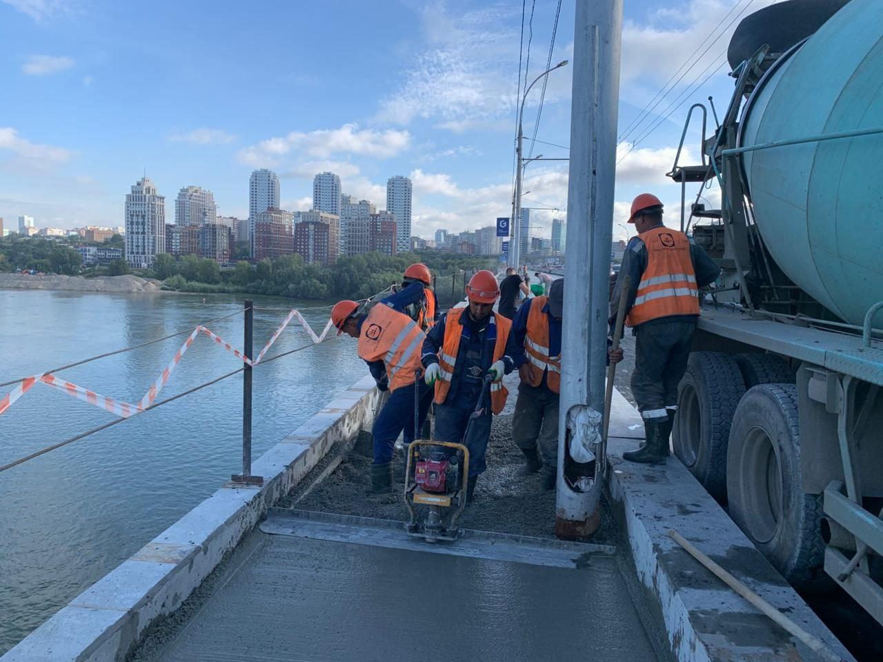 Специалисты ведут сразу несколько видов работ для оптимизации сроков ремонта. На дороге бетонируют крайний монолитный участок, устраивают выравнивающий слой на тротуаре, монтируют системы водоотвода и ремонтируют ограждения. Также начат монтаж деформационного шва на береговой опоре № 1.