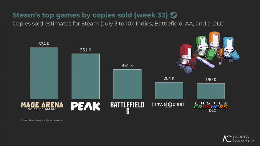 PEAK поднялась на второе место с 551 тысяч копий, общий объём продаж превысил 8 миллионов. Игра о совместном восхождении недавно получила скидку 38 %, что обеспечит ей хорошие результаты и на следующей неделе.