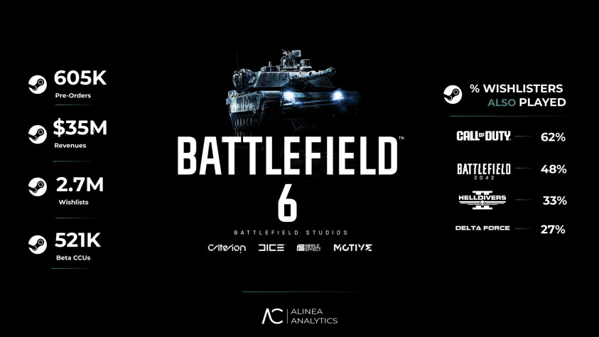 Battlefield 6 возвращает серию в строй с впечатляющими результатами ещё до официального запуска. Если верить аналитикам из Alinea Analytics, игра уже собрала более 600 тысяч предзаказов в Steam и попала в 2,7 миллионов списков желаемого. Доходы от этих предзаказов оцениваются примерно в 35 миллионов долларов только на платформе Valve. Эти цифры становятся особенно важными на фоне того, что франшиза в последние годы переживала спад.