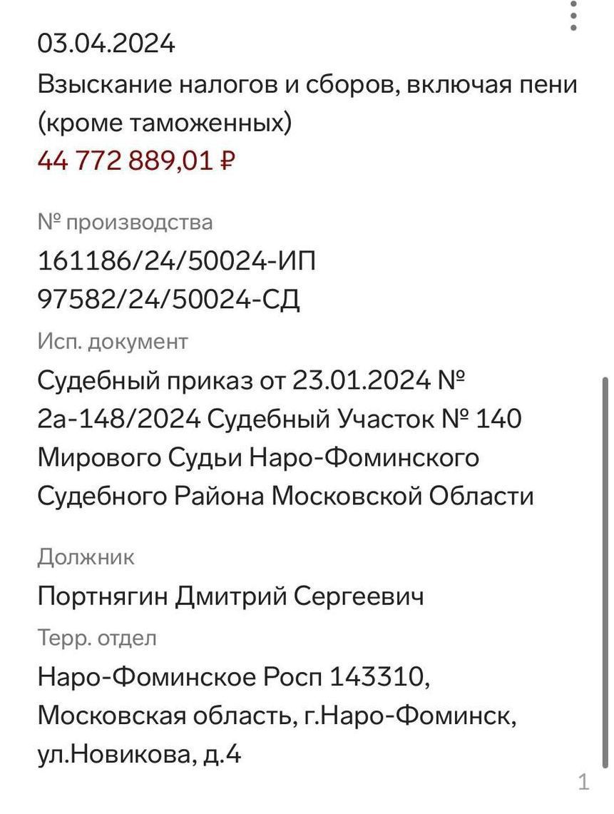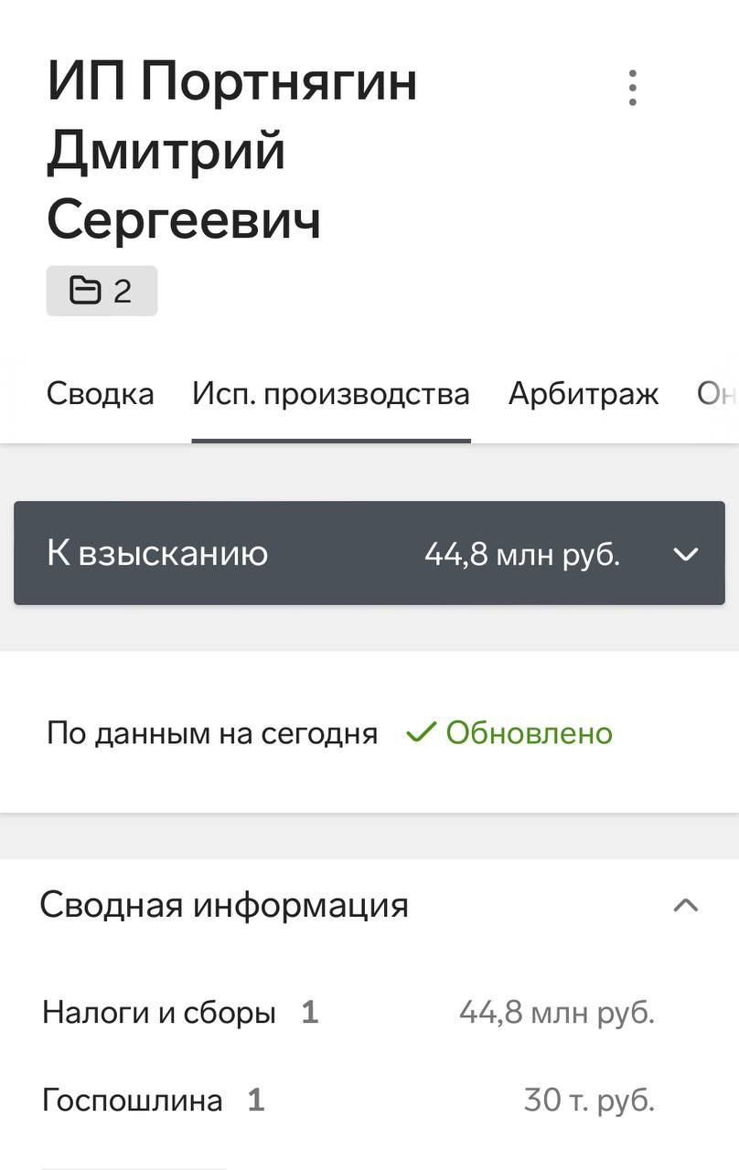 RT изучил документы о долгах Портнягина. Судя по открытым источникам, с него должны взыскать 44,8 млн рублей. Сам он говорит, что речь о 64 млн рублей.