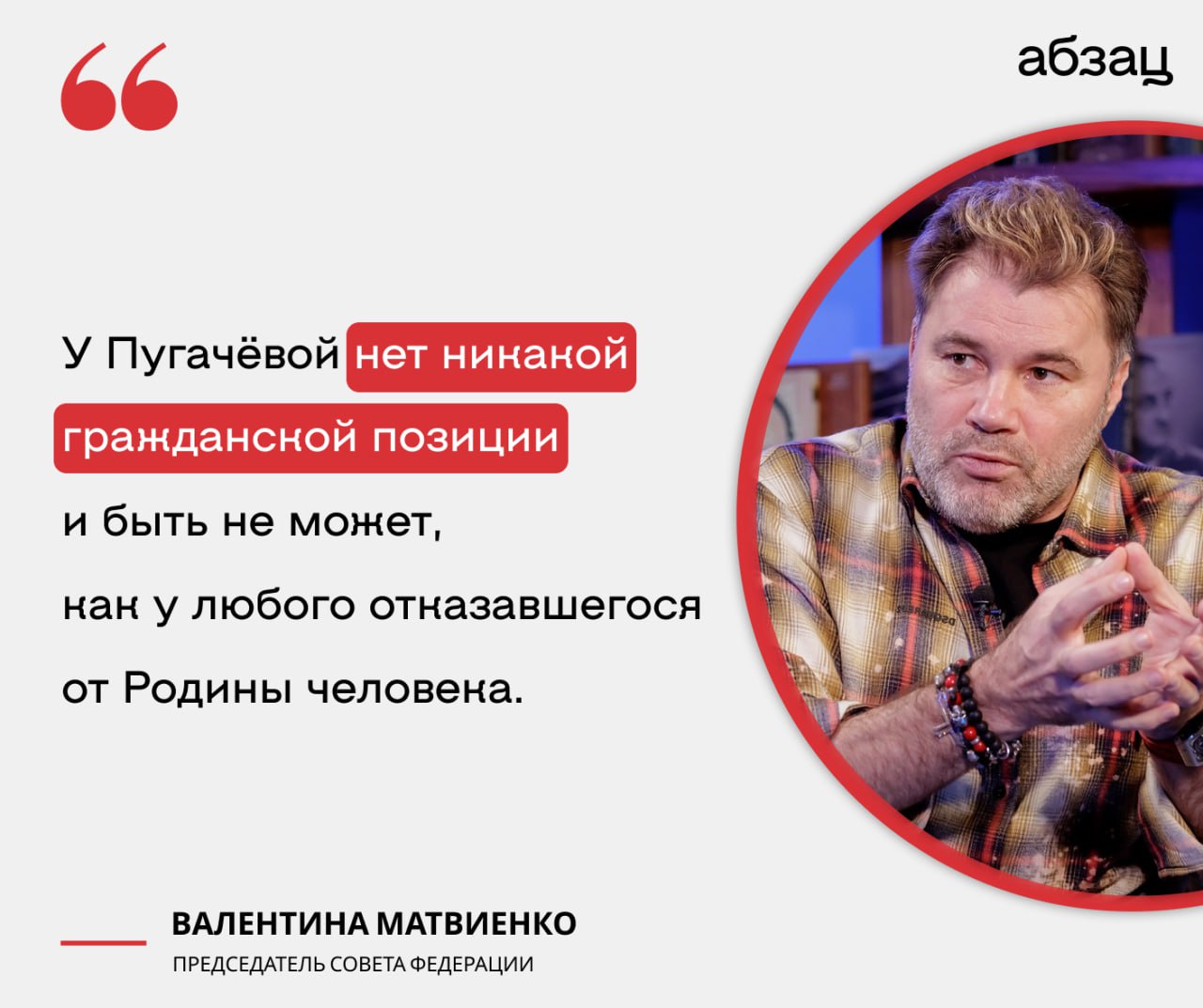 «Сегодня предатели понимают, что проиграли, поэтому показывают плохую игру при плохой постановке. Она и сама это видит. Со стороны её поступок выглядит просто ужасно. Судя по всему, она даже не понимает, где находится. У Пугачёвой нет никакой гражданской позиции и быть не может, как у любого отказавшегося от Родины человека. В других странах она не нужна. Нам она тоже теперь не нужна. Тем более она дружит с государством, которого даже не существует».