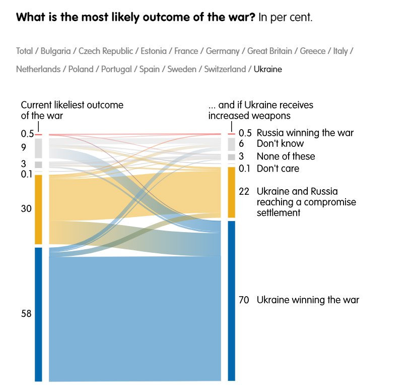 Ни в одной из европейских стран (кроме Эстонии), где проводился опрос, не верят в победу Украины при любом варианте больше, чем на 30-40%. В Швейцарии таких - 20%, в Швеции - 37%, в Испании - 18%, в Португалии - 28%, в Польше - 34%, в Нидерландах - 23%, в Италии - 8%, в Греции - 9%, в Великобритании - 26%, в Германии - 18%, во Франции - 23%, в Чехии - 23%, в Болгарии - 16%.