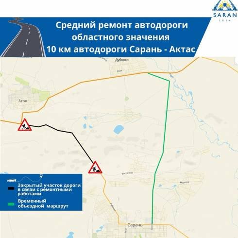 «На период проведения ремонта движение автобусов межрайонных (междугородних, внутриобластных) маршрутов №165 Караганда - Сарань, №127 Караганда - Шахан, № 204 Абай - Сарань необходимо осуществлять по участку автомобильной дороги республиканского значения через поселок Актас с последующим заездом в город Сарань на повороте после поселка Дубовка», - сообщают в акимате Сарани.