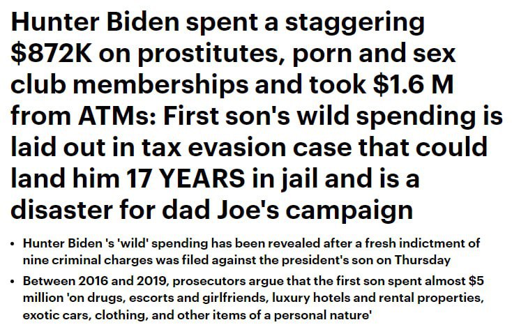 ▪️«Обвинение станет катастрофой для его отца, баллотирующегося на пост президента в 2024 г. В нем утверждается, что он «тратил эти деньги на наркотики, сопровождение и подруг, роскошные отели и аренду недвижимости, экзотические автомобили, одежду и другие предметы личного характера, короче говоря, все, кроме его налогов».