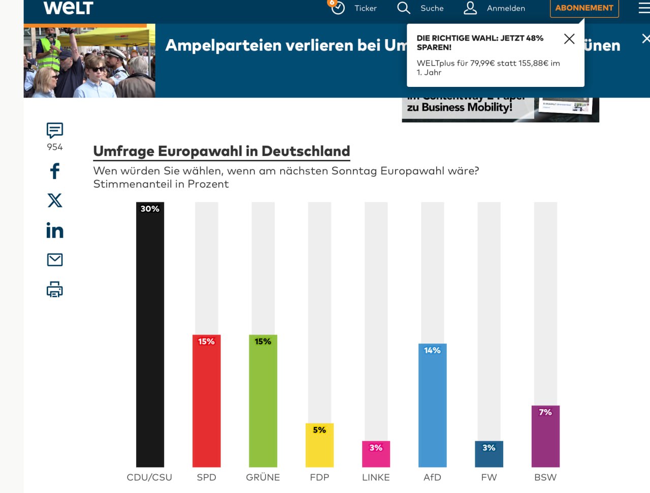 По опросам, Зеленые резко идут вниз и могут потерять на выборах в Евро-Парламент в воскресенье около четверти голосов по сравнению с 2019 годом. Потеряют и социал-демократы, которые в опросах идут вровень с АДГ. Союз Сары Вагенкнехт обгонит либералов, оставит далеко позади партию Левые. Особо не стоит доверять этим опросам, ведь 42 % вообще не решили будут ли выбирать вообще. Но крушение зелено-либерального блока точно состоится
