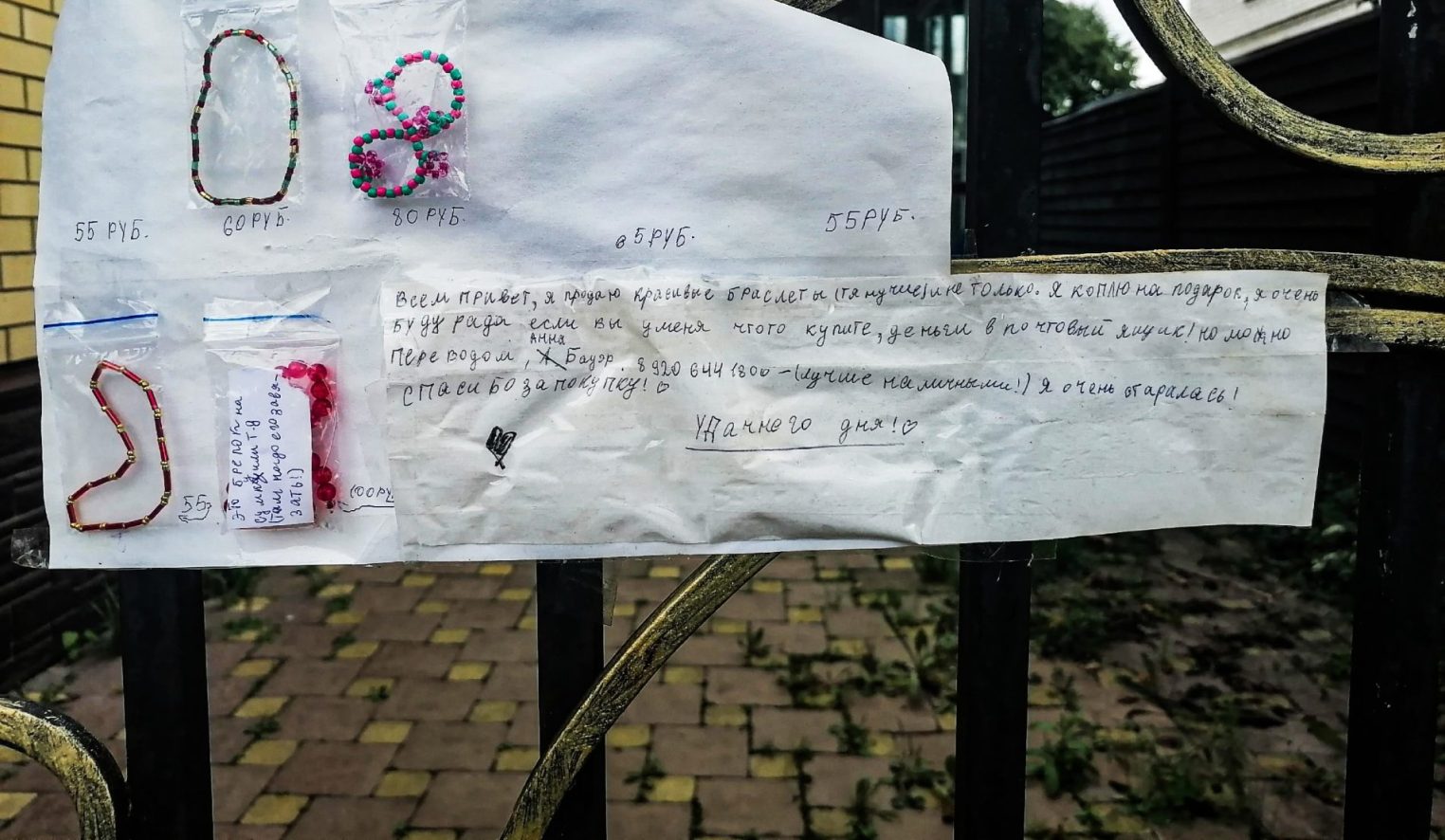 — Всем привет! Я продаю красивые браслеты и не только. Я коплю на подарок. Я очень буду рада, если вы у меня что-то купите, деньги — в почтовый ящик, можно переводом. Я очень старалась. Спасибо за покупку! — гласит объявление на заборе.