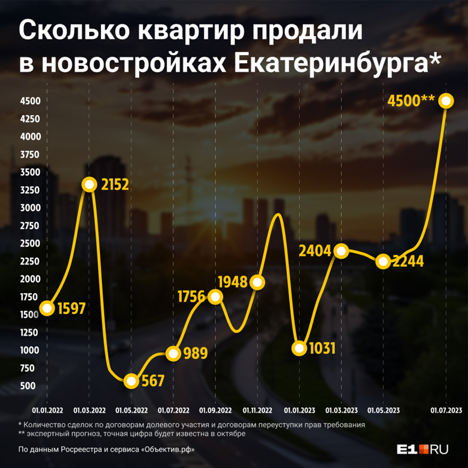 — Прогнозируемое количество сделок по итогам августа 2023 года может превысить 4500, и это станет рекордным показателем для рынка первичной недвижимости Екатеринбурга — больше количества сделок марта 2022 года, которое ранее считалось пиковым. Прежде всего такой мощный импульс рынку обеспечило резкое повышение ключевой ставки и последующие за ним корректировки ипотечных ставок: многие поспешили приобрести недвижимость на прежних условиях, — говорит Ксения Чернецкая.