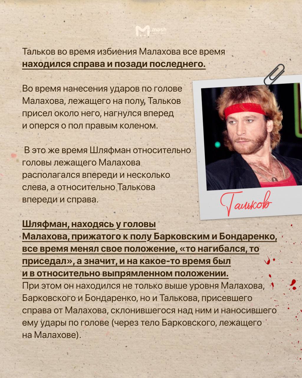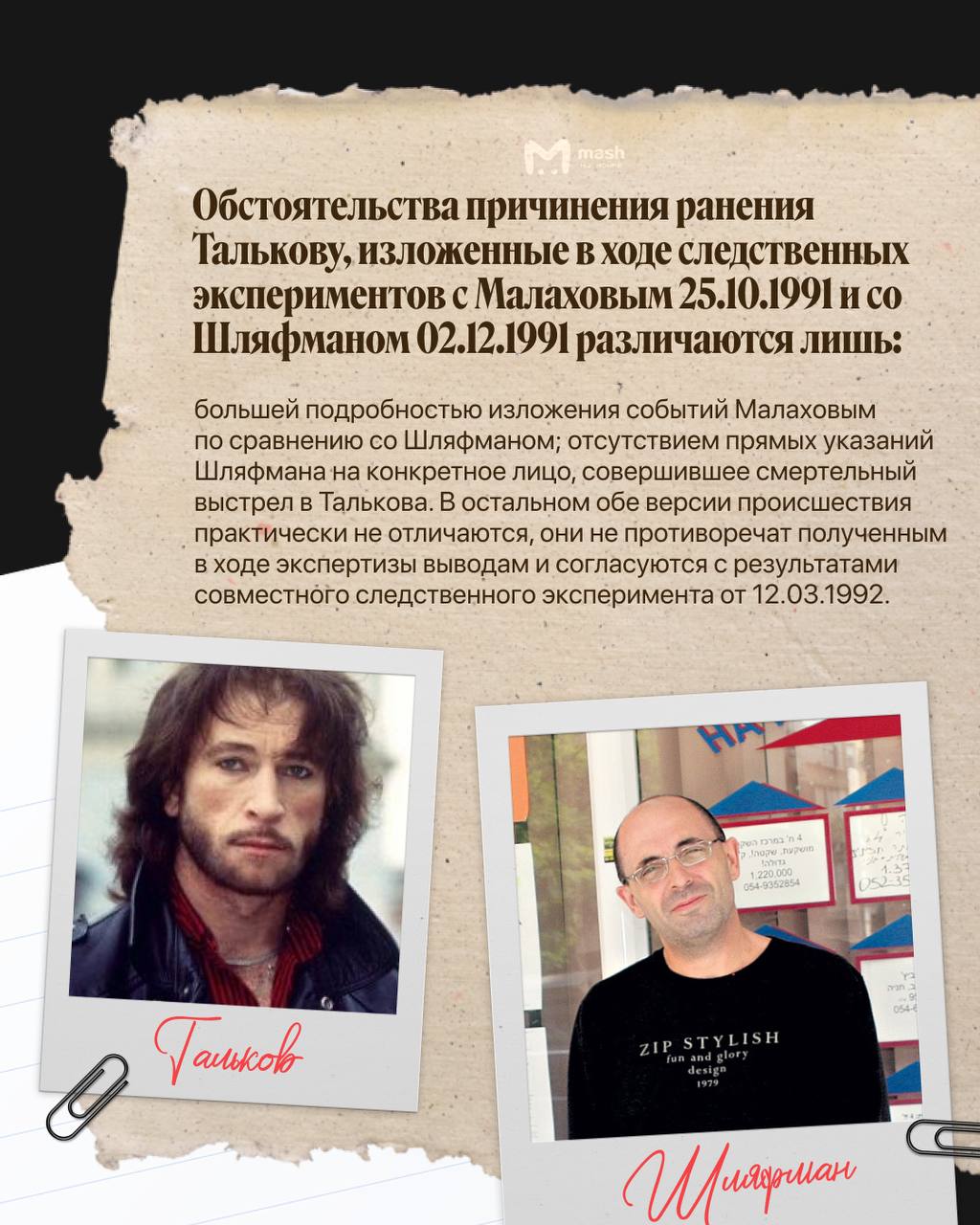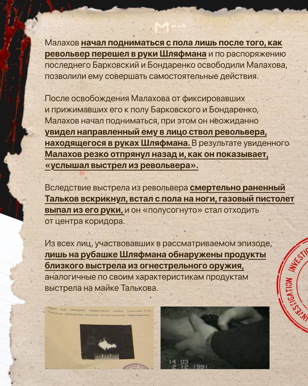 Телохранители артиста успели скрутить Малахова, а его руку с револьвером направили вниз — тот дважды выстрелил в пол, затем его повалили на спину. Тальков присел над обидчиком и начал наносить ему удары по голове. Характер ран музыканта свидетельствует о том, что выстрел в него сделан человеком, находящимся выше артиста, — таким образом, Малахов, лёжа, этого сделать не мог. Кроме того, револьвер в тот вечер в руках держал ещё и Шляфман. Он смог отобрать ствол у оппонента, лежащего на полу, и направить на Малахова.