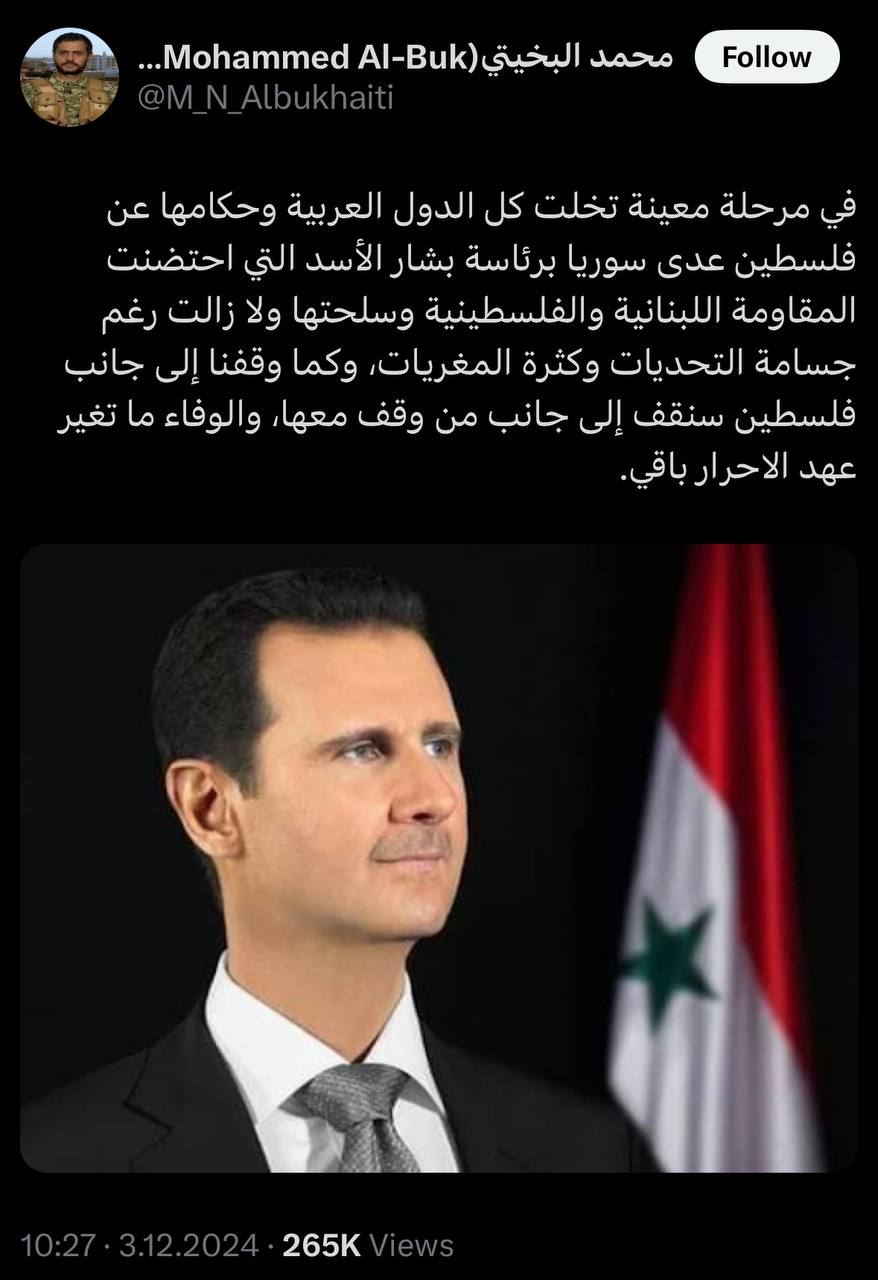 «В критический момент все арабские государства отказались от Палестины, кроме Сирии под руководством Башара Асада, которая поддерживала и вооружала ливанское и палестинское сопротивление. Несмотря на огромные трудности и искушения, Сирия остается непоколебимой. Так же, как мы поддерживали Палестину, мы будем поддерживать тех, кто ее поддерживал - верность остается залогом свободы».