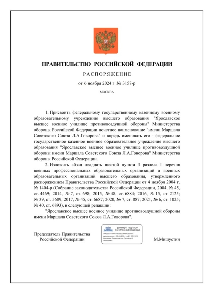Ярославское высшее военное училище ПВО будет носить имя маршала Советского Союза Леонида Александровича Говорова. Соответствующий приказ подписал председатель Правительства РФ Михаил Мишустин.