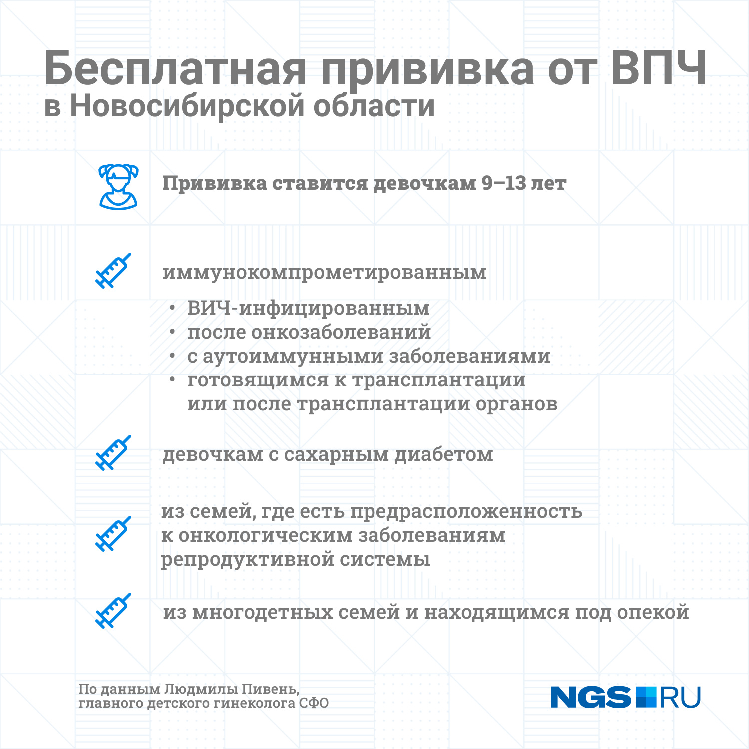 — Бесплатно прививку можно сделать по месту жительства в детской поликлинике по направлению гинеколога или педиатра. Вакцинации против вируса папилломы человека подлежат девочки в возрасте 9–13 лет из групп повышенного риска, — объяснила корреспонденту НГС Людмила Пивень, заведующая гинекологическим отделением Новосибирской областной больницы, главный детский гинеколог СФО, врач акушер-гинеколог. — Курс вакцинации состоит из двух доз с разницей в 6 месяцев.