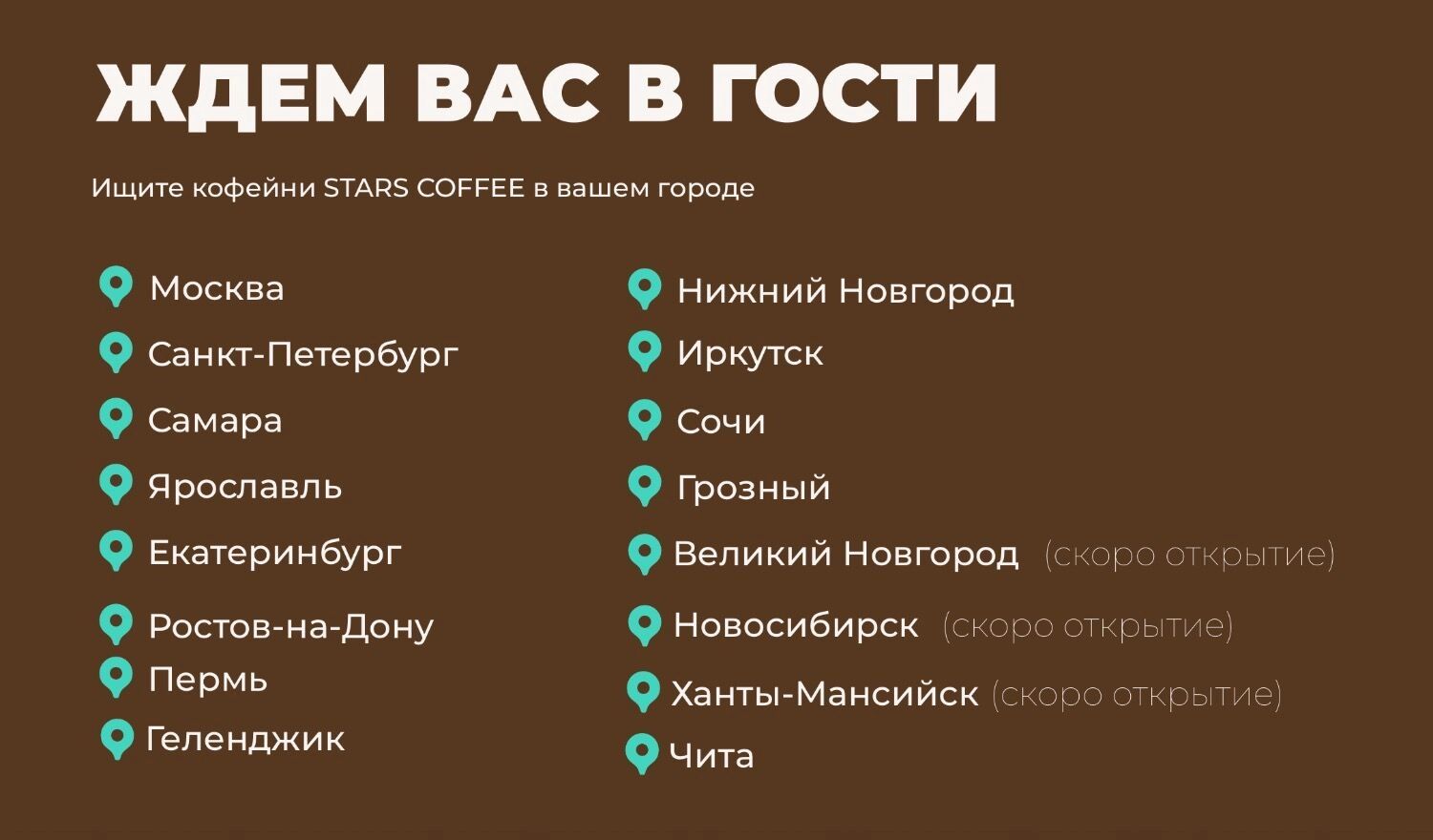 Известно, что Stars Coffee планирует запуск двух точек в Новосибирске. При этом на сайте сети Новосибирск уже есть в списке городов с пометкой «скоро открытые», а Красноярск туда не добавили.