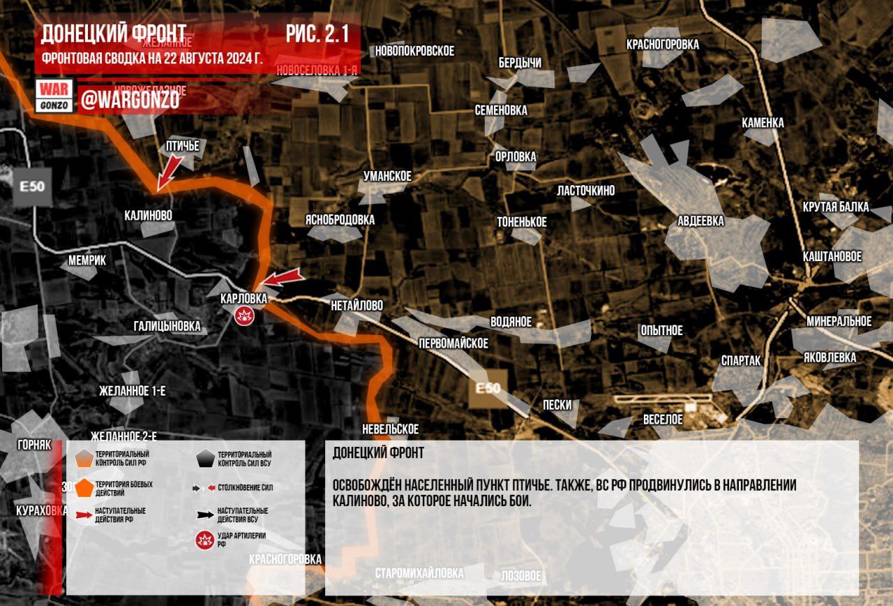Донецкий фронт. Продолжаются тяжелые бои в Константиновке. В Красногоровке ВСУ продолжают удерживать свои позиции, российские войска ведут методичную работу по выбиванию остатков украинского гарнизона. Освобождён населенный пункт Птичье. Также, ВС РФ продвинулись в направлении Калиново, за которое начались бои. (Рис. 2)