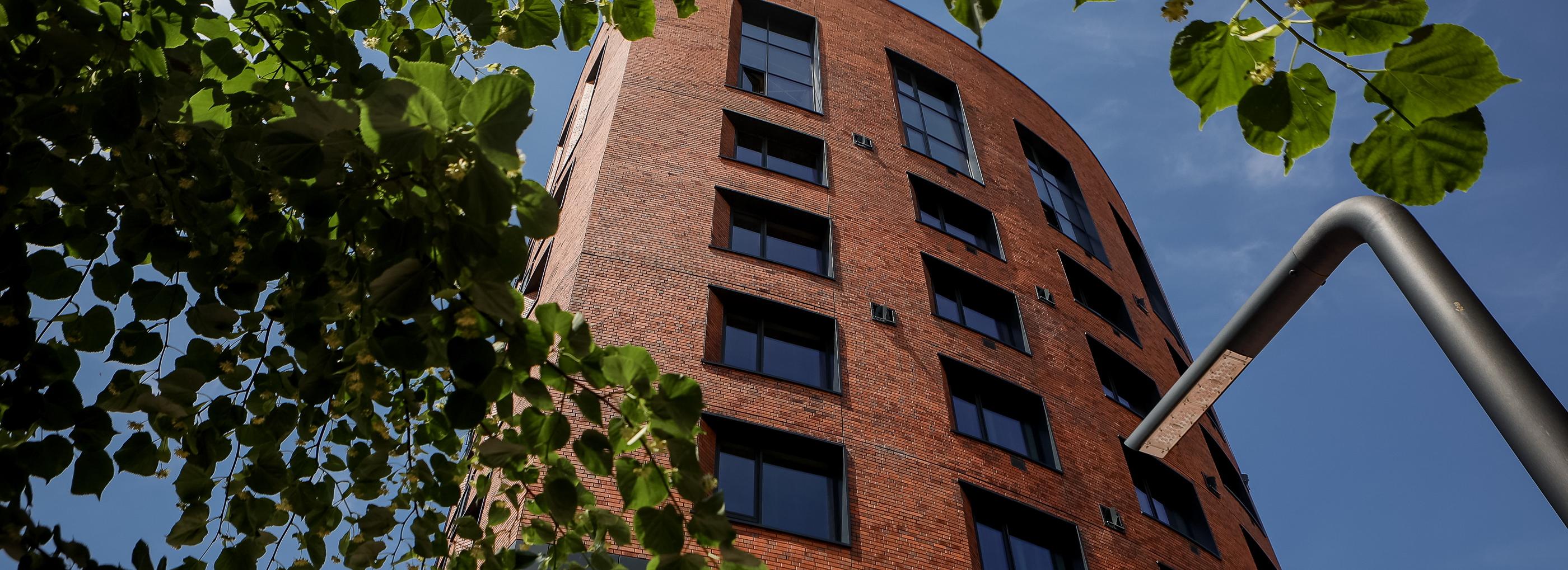 Восьмиэтажку бионической формы построили за два года в квартале на пересечении Советской и Ермака. Здание, созданное в пропорциях золотого сечения, компактно вписалось в существующую городскую среду. Фасад, отделанный немецким клинкерным кирпичом сдержанных тонов, отчасти замаскировал новостройку под соседние дома. Уникальность проекта — в его форме: один угол, плавные линии и чёрная «корона» на крыше. В квартирах ещё нет жильцов, идут ремонт и отделка.