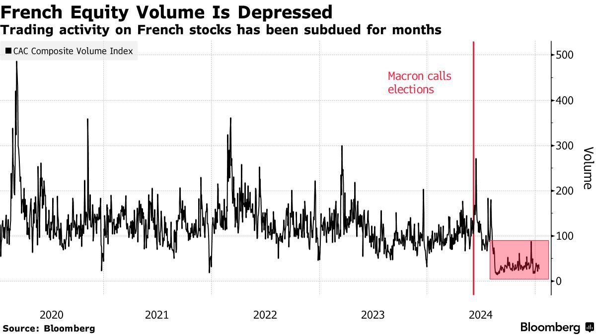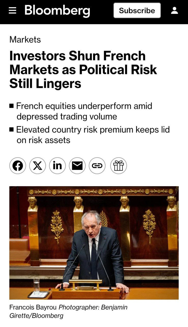 Инвесторы бегут из французских акций из-за политического кризиса. Попытка премьер-министра Франсуа Байру справиться с продолжающимся политическим кризисом оказалась недостаточной для возвращения инвесторов. Французские активы так и не оправились от удара, нанесенного более полугода назад, когда президент Эммануэль Макрон объявил о внеочередных выборах. Фондовый индекс CAC 40 в этом году отстает от европейских индексов, а страховка от дефолта растет. Дополнительная доходность, которую требуют инвесторы за владение французскими, а не немецкими облигациями, составляет около 80 базисных пунктов — почти вдвое больше, чем до голосования. Торговая активность на французском рынке падает с августа.