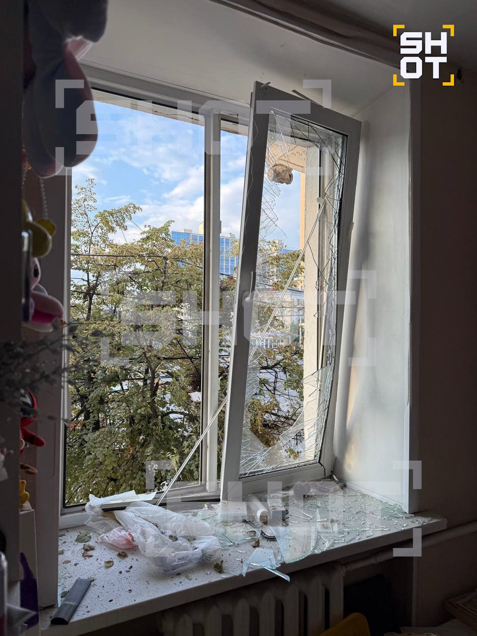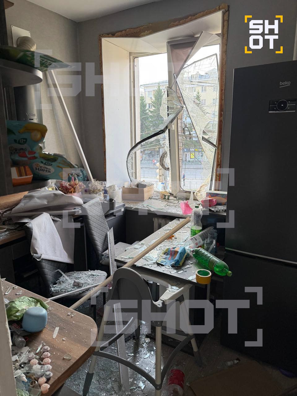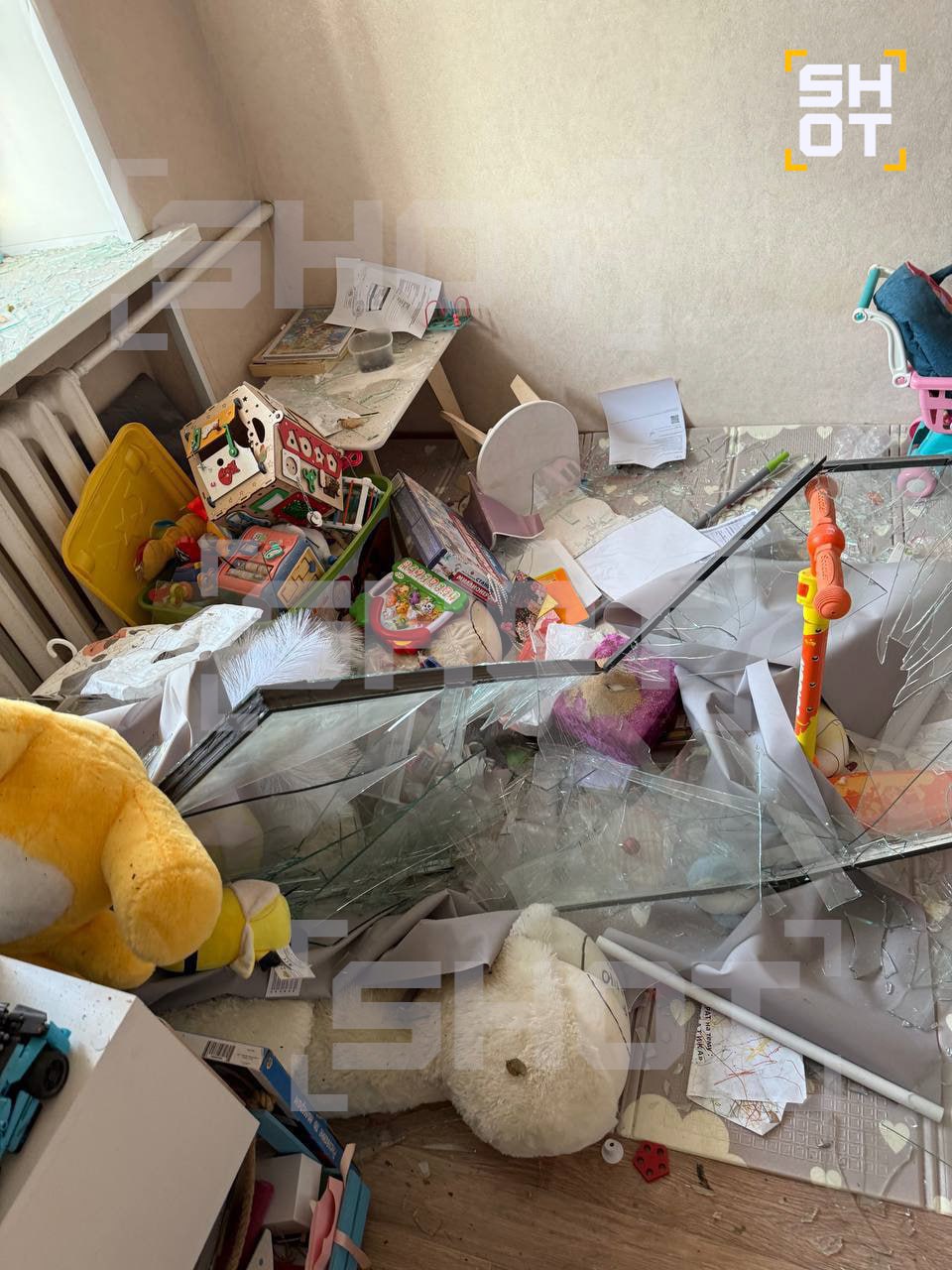 В доме выбиты стёкла, сломана мебель в детской комнате и на кухне. Предварительно, жильцы получили лёгкие ранения — в ванной следы крови.