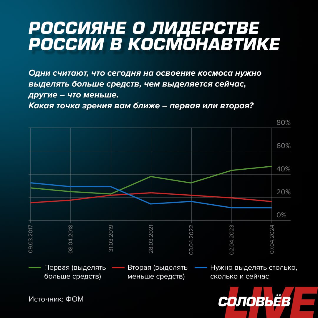 Их доля составляет 63% (на 30 п. п. больше, чем в к 2012-м). Помимо этого, почти половина опрошенных думают, что сегодня на освоение космоса нужно выделять больше средств (46%).