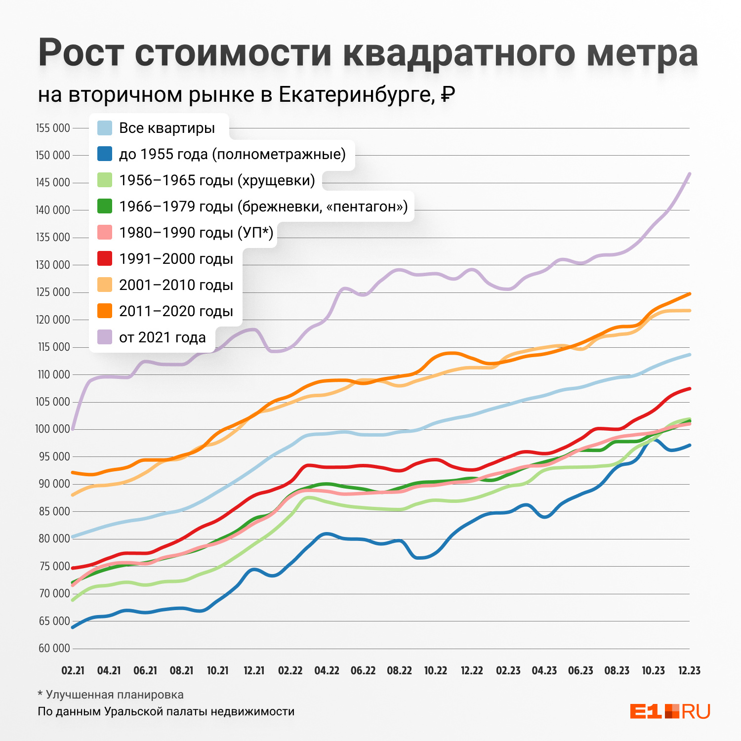 За прошедший 2023 год сильнее всего в Екатеринбурге подорожали квартиры в старых домах. Так, в конце года квадратный метр в доме, построенном до 1995-го, стоил 97 тысяч рублей, а годом ранее — 83 тысячи. Такие цифры привел глава аналитического отдела Уральской палаты недвижимости Михаил Хорьков.