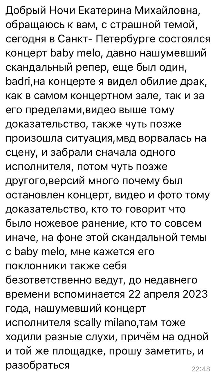 Малолетний рэпер Baby Melo вчера прямо со сцены отправился в отдел полиции, а потом, видимо, к маме (ранее привлеченной к ответственности за неисполнение родительских обязанностей). Если, конечно, его не привлекают к уголовной ответственности. Продвигать наркотики среди молодежи - плохо. Вместе с ним в отдел полиции уехал еще один рэпер, а также 17 человек в состоянии алкогольного либо наркотического опьянения. Кроме того, подписчики сообщают о драках на концерте и за его пределами, ножевом ранении человека. Причем избивали даже девочек. Полиция Санкт-Петербурга - молодцы 💪