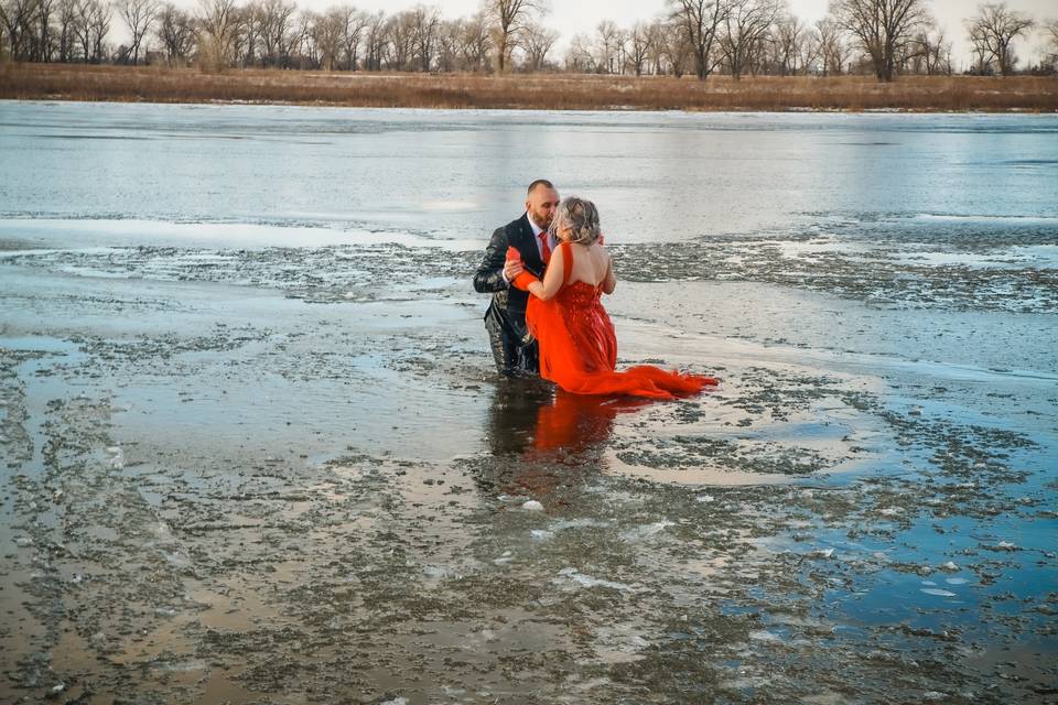 И какие же эффектные получились фото. Синяя вода, немного покрытая льдом, невеста в потрясающем красном платье (да, каноны нарушились и здесь) и голубое небо. Счастья молодым!