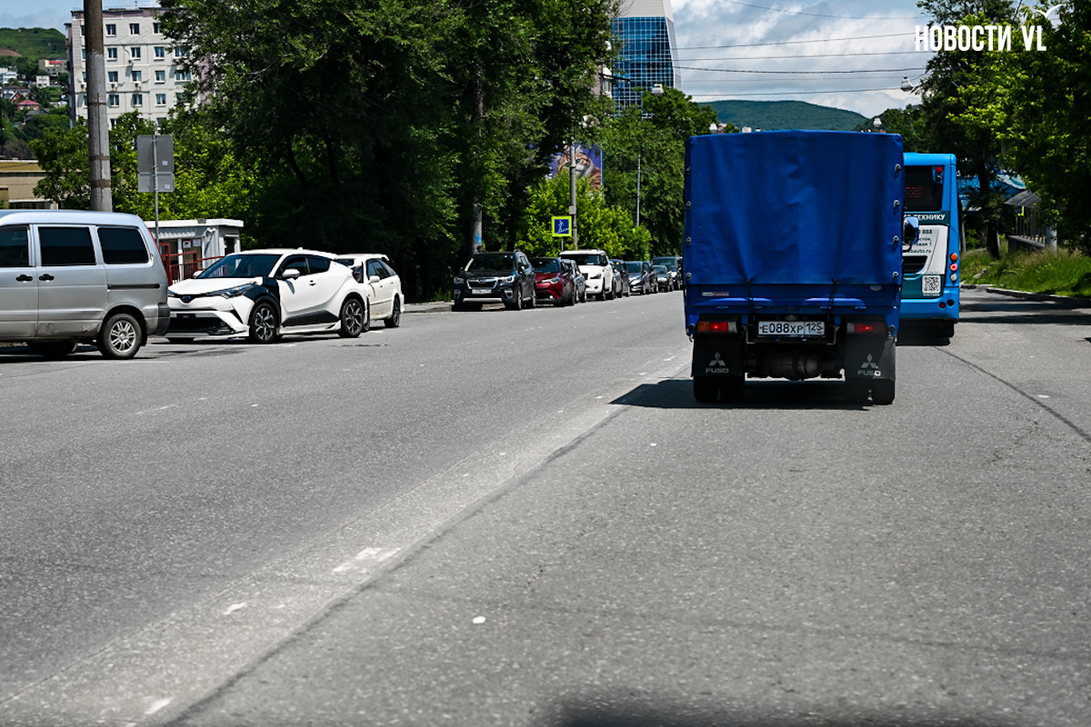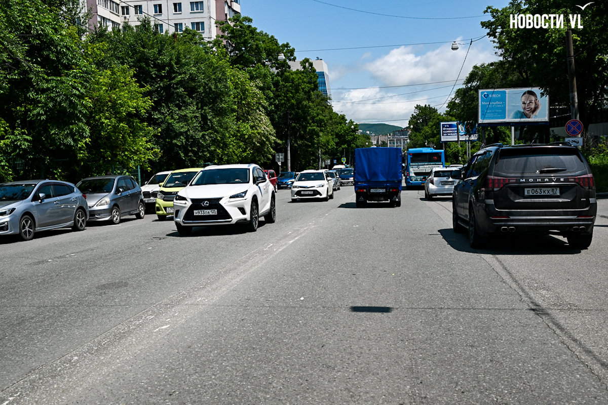 Городские службы до сих пор не обновили разметку на Океанском проспекте, в новой зоне платной парковки, но уже нанесли так называемые тычки – точки, по которым пройдут осевые линии. Судя по ним и по схеме будущем платной парковки, для езды останется четыре полосы, но они станут более узкими. А если машины будут по привычке парковать на чётной стороне дороги, то в сторону Некрасовской останется только одна полоса.