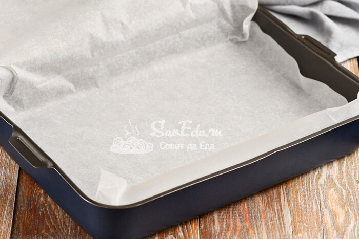 1. От пергамента для выпечки отрезаем большой кусок, складываем его пополам и размещаем в форме (размер 26 х 35 см). Бумага с силиконовым покрытием.