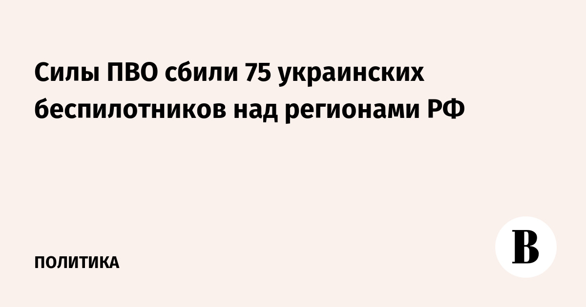 За ночь дежурные средства ПВО перехватили и уничтожили 75 украинских беспилотников самолетного типа над регионами России. Об этом говорится в сообщении Минобороны РФ.