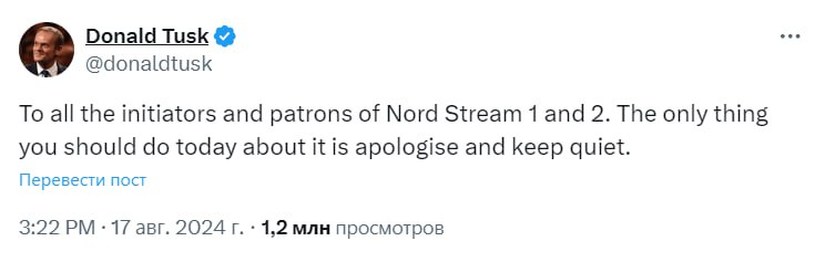Премьер-министр Польши Туск заявил, что покровители и инициаторы «Северных потоков» должны «попросить прощения и замолчать»