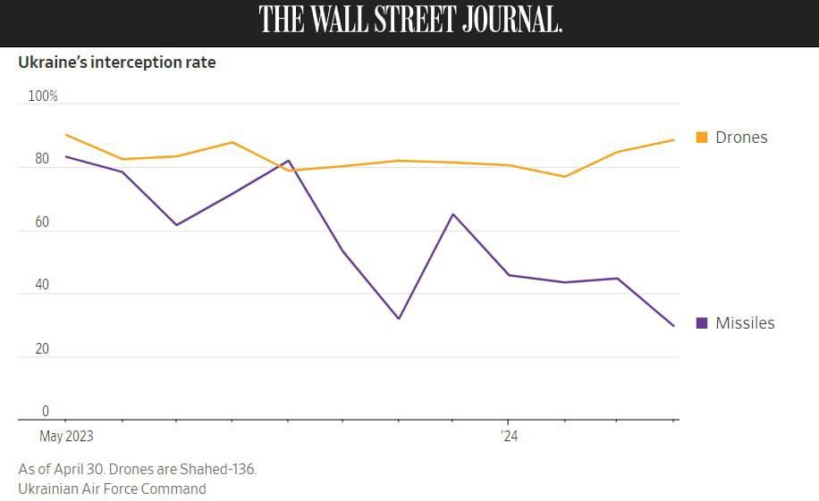 🇺🇦Результативность работы украинских систем ПВО значительно упала в сравнении с началом СВО – The Wall Street Journal