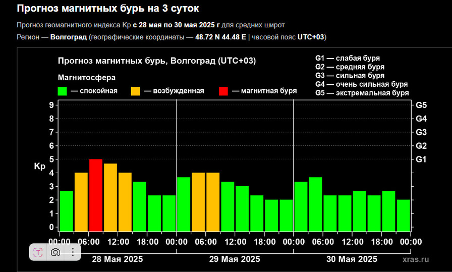 Согласно прогнозам ученых, в связи с повышением скорости солнечного ветра в среду, 28 мая, ожидается слабая магнитная буря G1.0 (Kp = 5). Своего пика буря достигнет примерно к десяти утра, а затем, после полудня, пойдет на спад, однако ее последствия могут сохраняться до вечера.