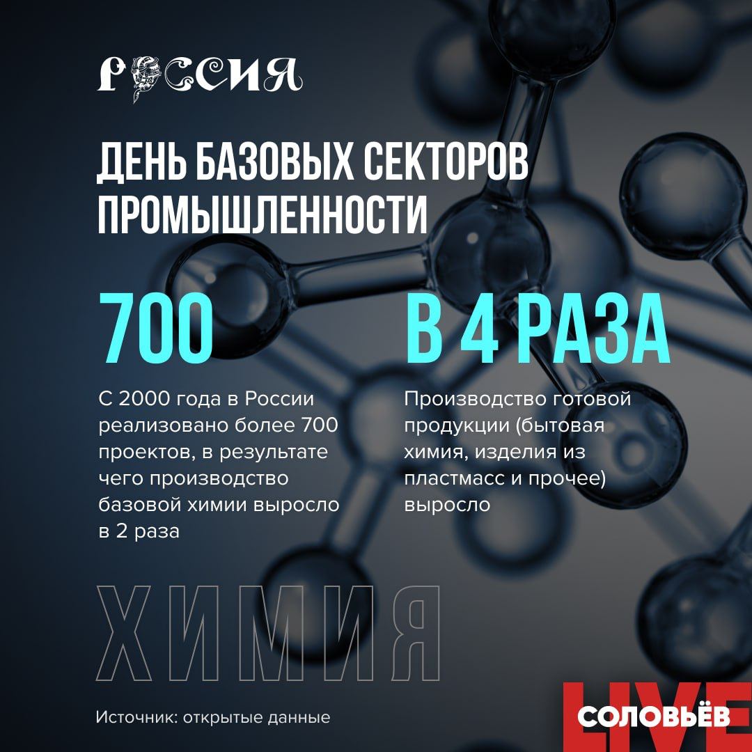 ▪️С 2000 года в России реализовано более 700 проектов, в результате чего производство базовой химии выросло в 2 раза.