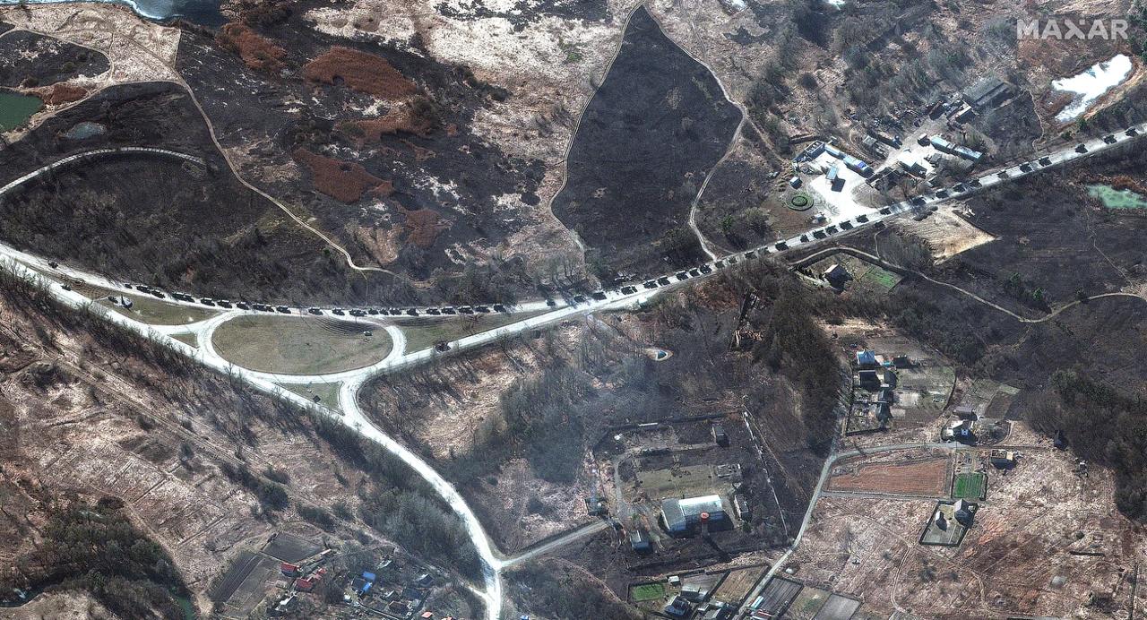 На фото — опубликованный в 2022 году компанией Maxar снимок 60-километровой колонны ВС РФ под Киевом.