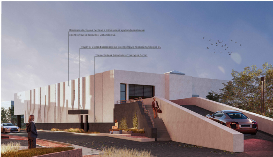 Архитектор рассказала, что фасад здания будет облицован панелями «Сибалюкс», цоколь оштукатурен. Выразительность фасаду придадут вентиляционные решетки, перекликающиеся с фасадом жилого дома.