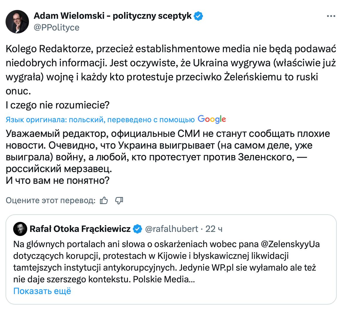 Польский профессор Адам Виломский отметил, что тамошние СМИ поначалу вообще не замечали протестов против Зеленского и обвинений его в коррупции. В этой связи он пишет: «СМИ истеблишмента не станут сообщать плохие новости. Очевидно, что Украина выигрывает (на самом деле, уже выиграла) войну, а любой, кто протестует против Зеленского, — российский мерзавец. И что вам не понятно?»