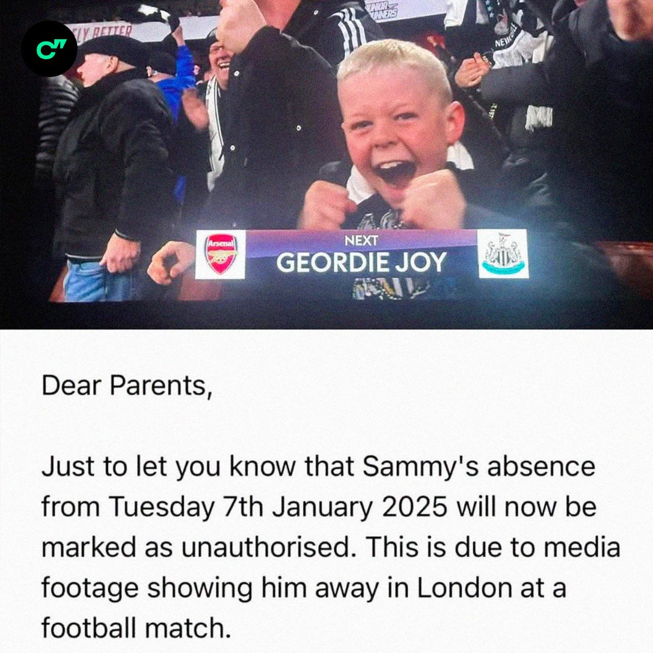 🏴👦 В соцсетях завирусилось фото юного болельщика «Ньюкасла» с полуфинала Кубка лиги против «Арсенала» (2:0), куда он отправился вместо уроков. Вместе с фото стало популярным и письмо его родителям из школы: