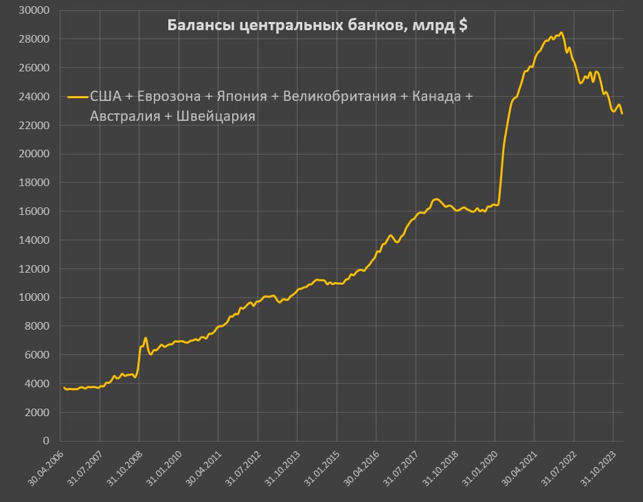 Перед фазой монетарного бешенства 2020-2021 совокупный баланс ведущих Центробанков составлял 16.5 трлн, спустя два года в феврале 2022 баланс вырос до 28.5 трлн или 12 трлн чистого выброса ликвидности за два года.
