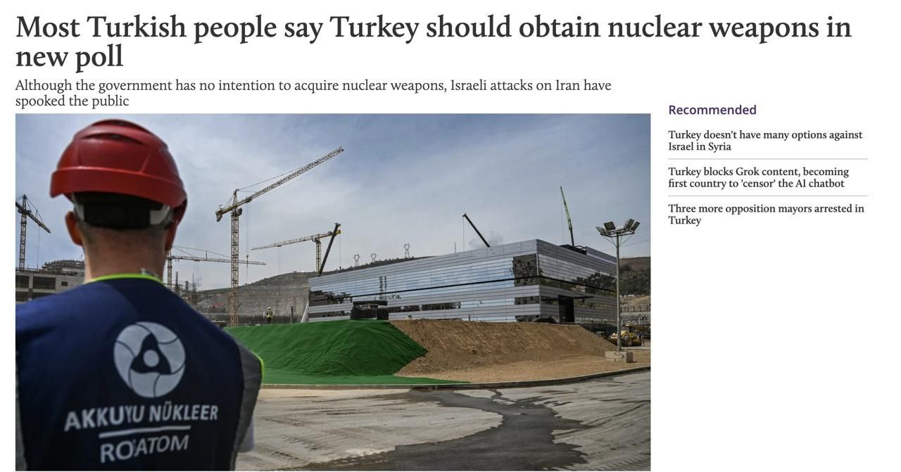 📊 После израильских нападений на Иран новые опросы показывают, что 71% турок в настоящее время поддерживают разработку ядерного оружия, несмотря на обязательства Турции по ДНЯО