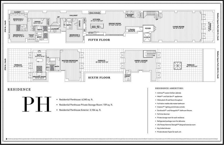 В доме площадью 9 500 кв. футов (2 895 кв. м) расположены 4 спальни и 7 ванных комнат. Дом круглосуточно охраняется. В здании есть лифт (А как же без него? В этот момент вспоминаем сцену из фильма «Секс в большом городе», где Кэри и Биг поднимаются к пентхаусу мечты).